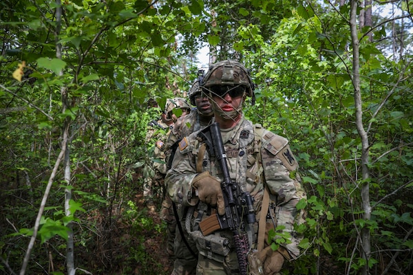 Louisiana National Guard soldiers conduct platoon tactical movements during Exportable Combat Traini... Photo Details >
