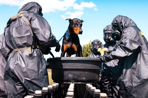 Marines wash simulated chemical contaminants off a mock animal casualty during an exercise in Perry,... Photo Details >