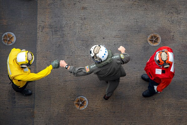 Navy Adm. Steve Koehler, commander of the U.S. Pacific Fleet, greets sailors on the flight deck of t... Photo Details >