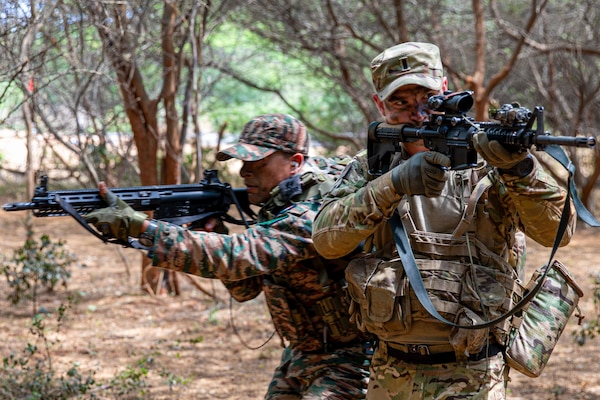 A U.S. soldier provides cover for an Indian soldier during Exercise Tiger Triumph in Visakhapatnam, ... Photo Details >