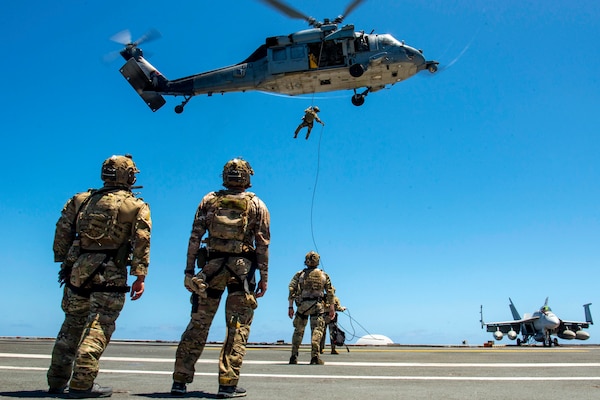 Sailors rappel out of an MH-60S Sea Hawk helicopter onto the flight deck of the USS Nimitz in the Pa... Photo Details >