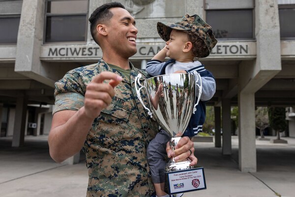 Marine Corps 1st Lt. John Carter holds his son following the 2024 Camp Pendleton Male Athlete of the... Photo Details >
