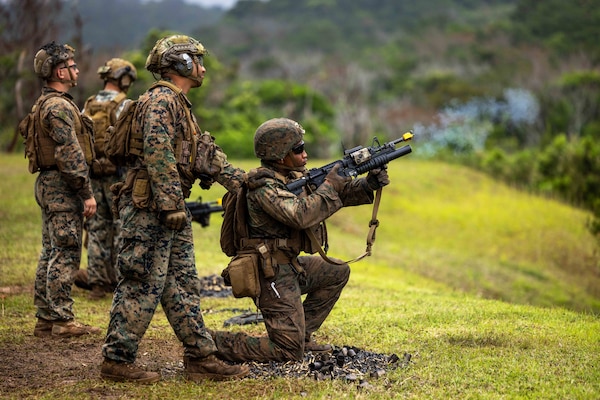 Marines fire M203 grenade launchers during Ryukyu Hammer 25 at Camp Hansen, Japan, April 23, 2025. R... Photo Details >