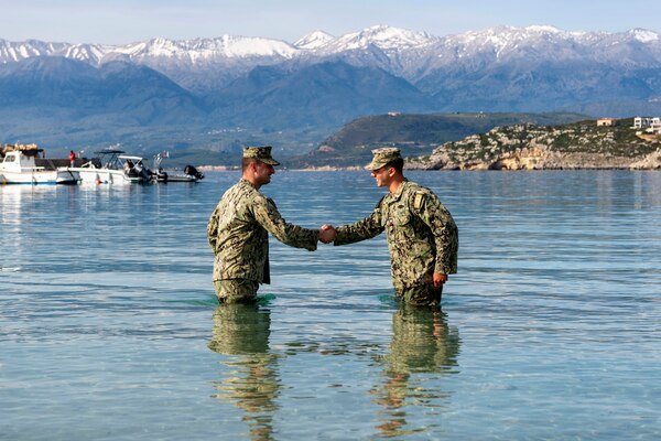 Navy Lt. j.g. Matthew Whaley reenlists Petty Officer 1st Class Robert Ciccone at Naval Support Activ... Photo Details >