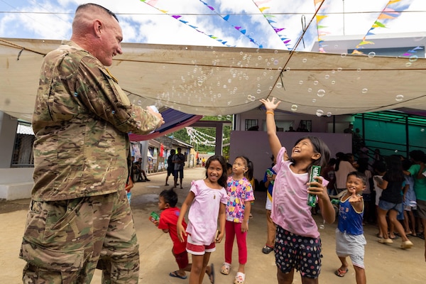Army Master Sgt. Chris E. Roach blows bubbles with children during Exercise Balikatan 25 at Barangay... Photo Details >