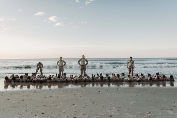Marines and sailors participate in a beach workout during Corporal's Course at Camp Lejeune, N.C., M... Photo Details >