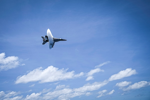 A Navy F/A-18E Super Hornet breaks the sound barrier near the USS Nimitz, not pictured, in the South... Photo Details >