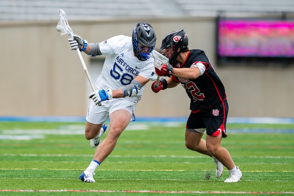 Air Force's Wes Peene pushes against Zachary White of the University of Utah during a lacrosse game ... Photo Details >