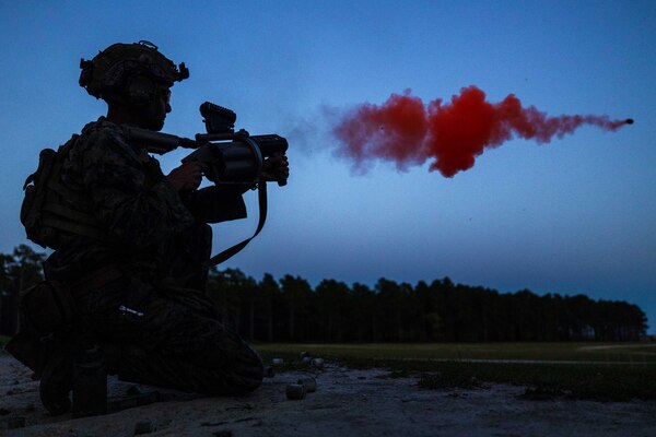 Marine Corps Lance Cpl. Aidan Smith fires an M32 grenade launcher during Exercise Chesapeake 25 at M... Photo Details >