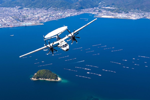 A Navy E-2D Hawkeye flies over Iwakuni, Japan, during Marine Corps Air Station Iwakuni's 46th Friend... Photo Details >