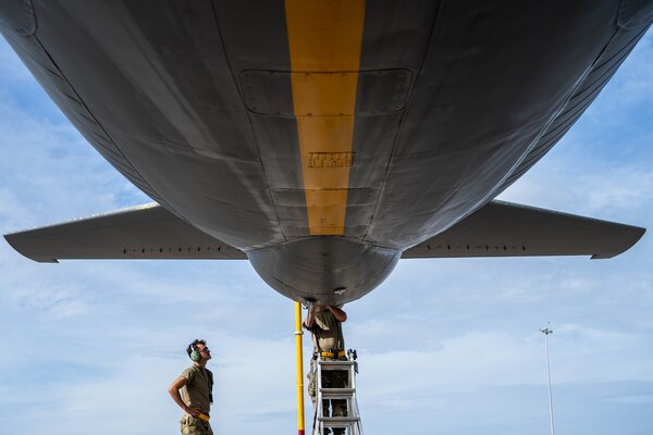 Air Force Airman 1st Class Jacob Feuz, left, and Airman Nicholas Summerlin inspect a KC-135 Stratota... Photo Details >
