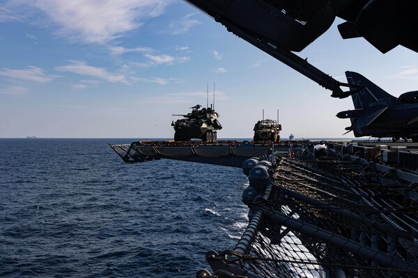 Marines provide defense to the amphibious task force during a simulated strait transit aboard the US... Photo Details >