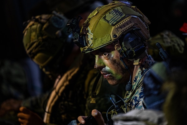 A U.S. Marine prepares for an amphibious landing in a Netherlands navy landing craft as part of Exer... Photo Details >