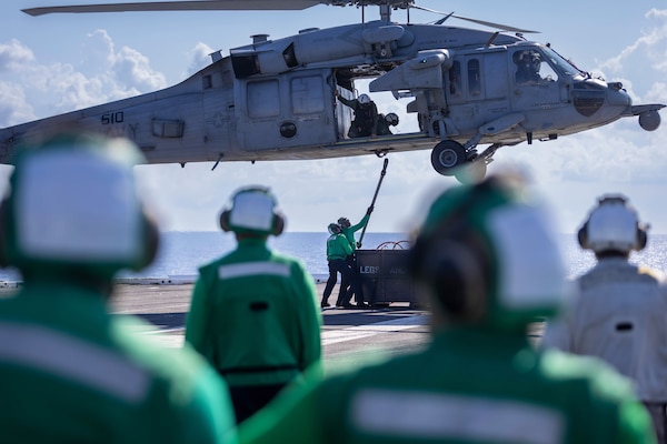 Sailors aboard the USS George H.W. Bush replenish a helicopter as part of Exercise Atlantic Alliance... Photo Details >