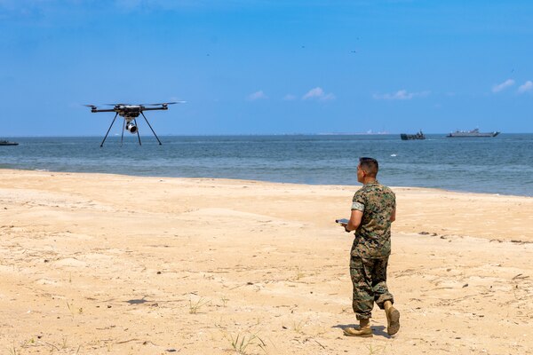 Marine Corps Chief Warrant Officer 4 Izzel Sanchez pilots a small unmanned aircraft system during an... Photo Details >