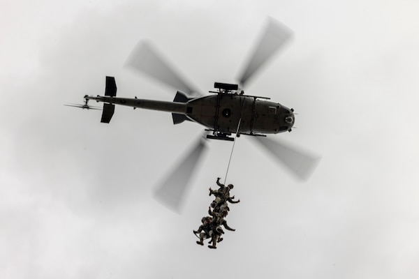 Marines suspend from a UH-1Y Venom helicopter during special patrol insertion and extraction trainin... Photo Details >