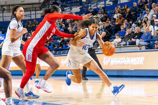 Air Force's Jayda McNabb drives to the basket around University of Nevada Las Vegas' Meadow Roland d... Photo Details >