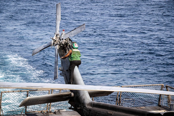 A sailor conducts maintenance on an MH-60R Sea Hawk aboard the USS Frank E. Petersen Jr. during Oper... Photo Details >