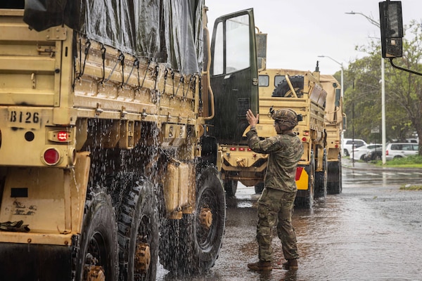A soldier guides a light medium tactical vehicle during staging operations to help communities impac... Photo Details >